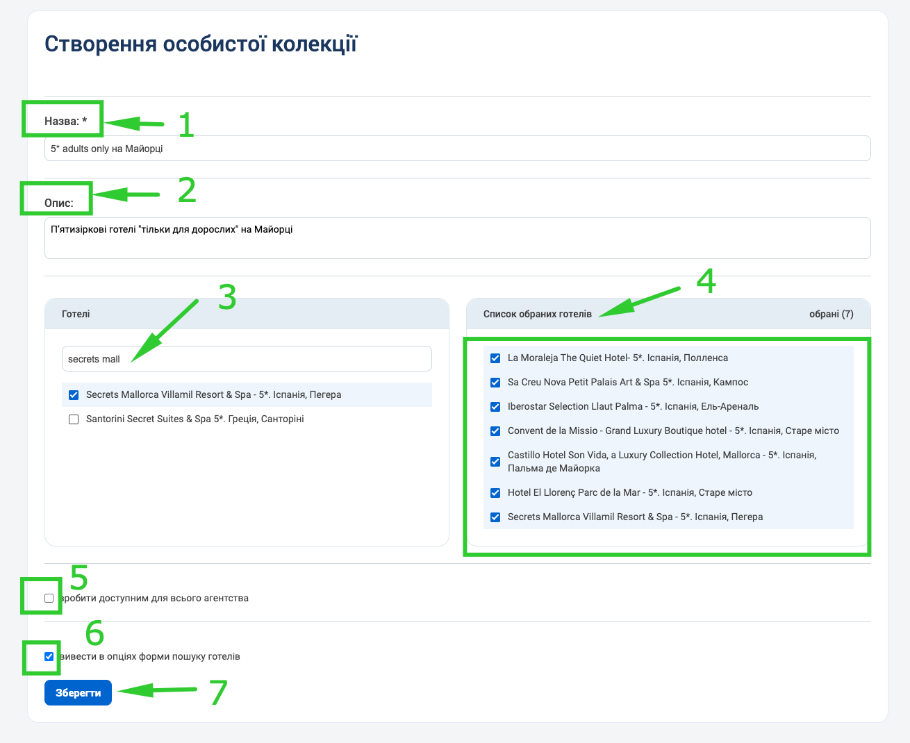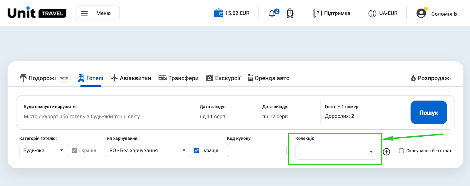 6. Поставте тут “пташку” і поле “Колекції” зʼявиться на головній сторінці пошуку Готелів вашого кабінету. Ось тут: