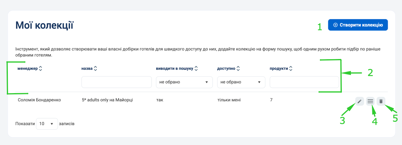4. Видаляти або додавати готелі до існуючої колекції.